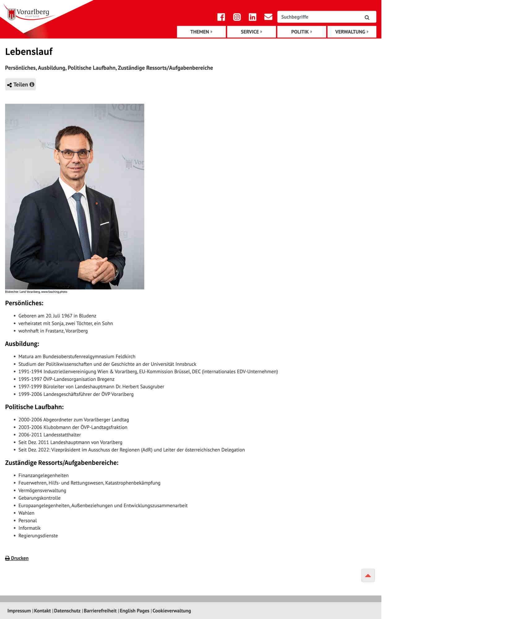 Quelle: Land Vorarlberg; Persönliche Seite (Zugriff: 09.09.2025) Screenshot/Dokument: screencapture-vorarlberg-at-lhwallner-lebenslauf-2025-09-09-11_04_34.jpg