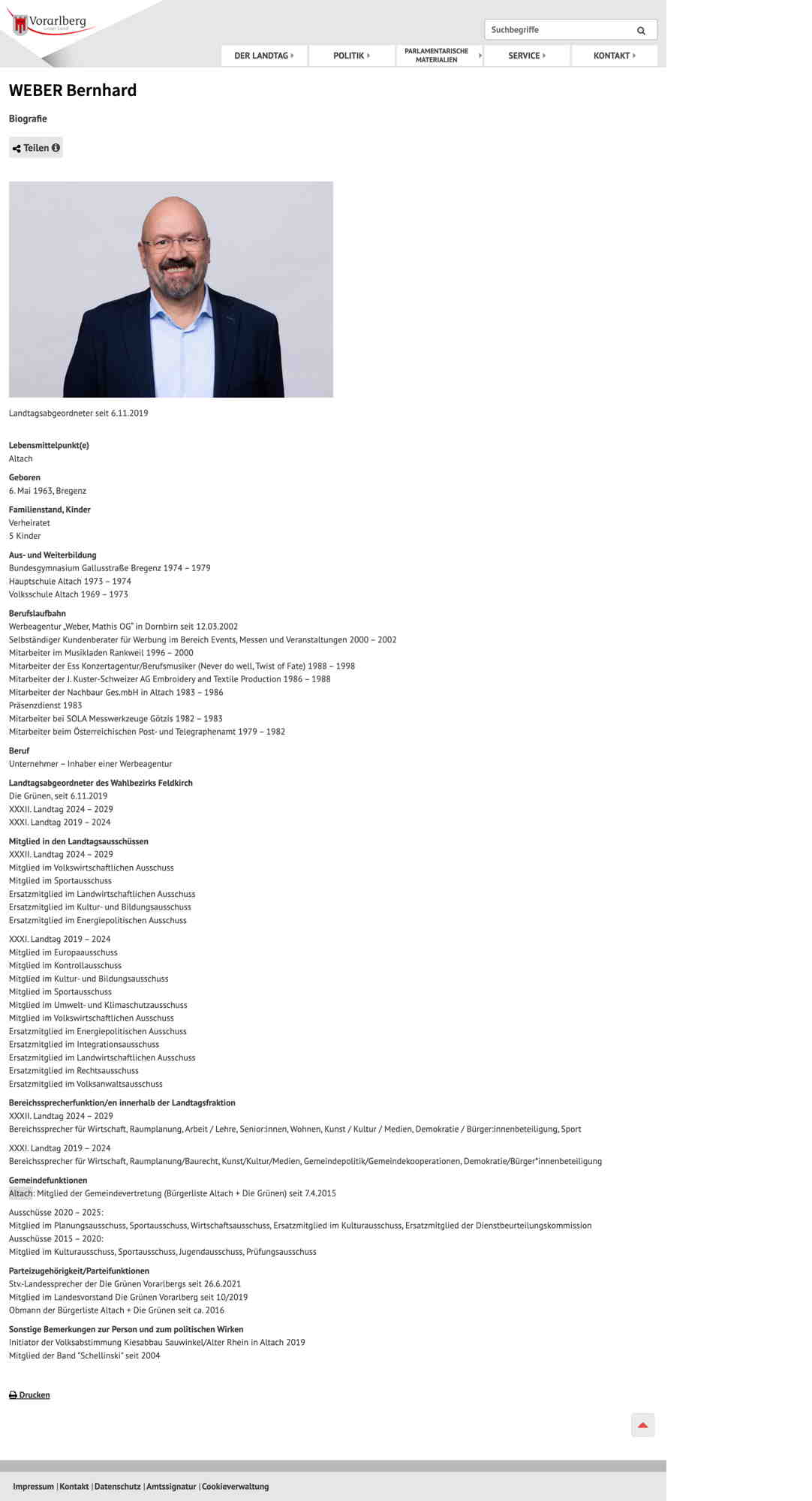 Quelle: Persönliche Seite; LTG V (Zugriff: 16.07.2025) Screenshot/Dokument: screencapture-vorarlberg-at-web-landtag-weber-bernha-1-2025-07-16-10_28_21.jpg