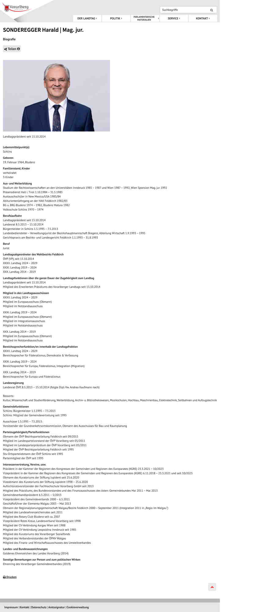 Quelle: Persönliche Seite; LTG V (Zugriff: 16.07.2025) Screenshot/Dokument: screencapture-vorarlberg-at-web-landtag-sonderegger-harald-bio-2025-07-16-10_40_48.jpg