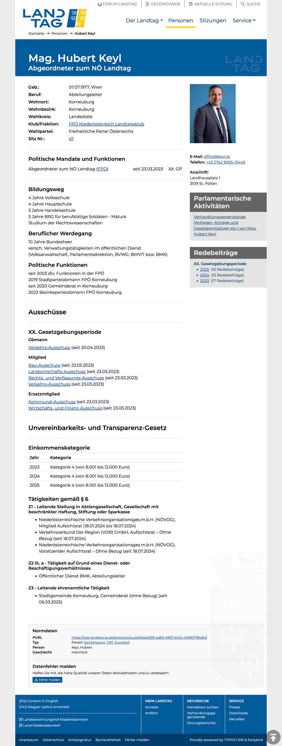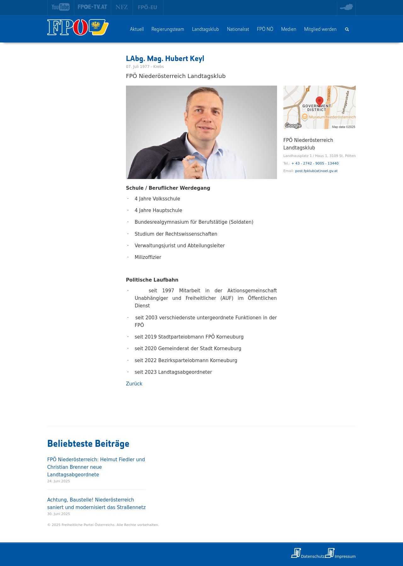 Quelle: Persönliche Seite; LTG NÖ (Zugriff: 15.07.2025) Screenshot/Dokument: screencapture-noe-landtag-gv-at-personen-hubert-keyl-2025-07-15-12_54_10.jpg