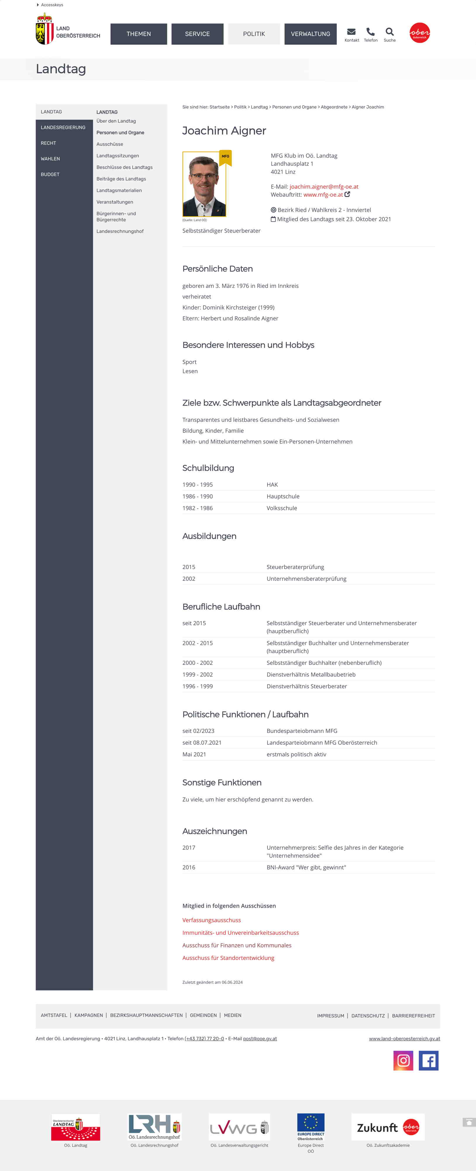 Quelle: Persönliche Seite; LTG OÖ (Zugriff: 16.05.2023) Screenshot/Dokument: www.land-oberoesterreich.gv.at_2023-05-16_7069.jpg