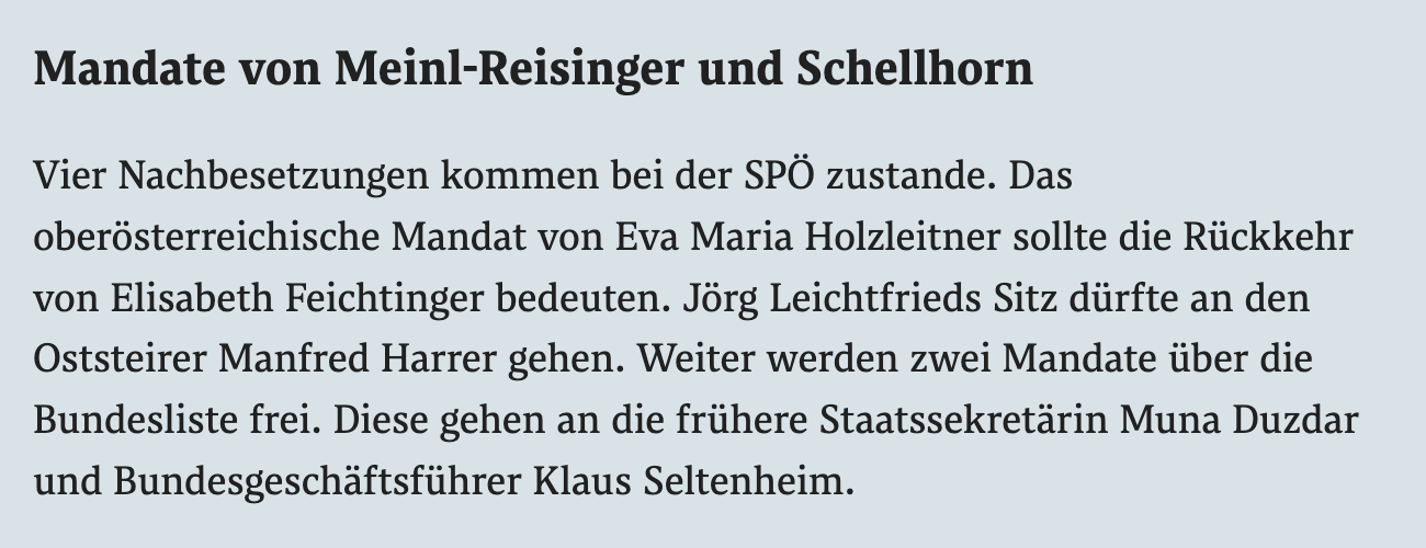 In dieser Rubrik listen wir alle historischen und aktuellen Mandate und Exekutivfunktionen im österreichischen Parlament (Nationalrat, Bundesrat und Bundesregierung), im Europaparlament, in Landtagen und Landesregierungen, in Stadt- und Gemeinderäten und in den Wiener Bezirksräten. Die Parlamentsmandate sind vollständig, alle anderen konnten nur teilweise recherchiert werden, hauptsächlich aus den Eigenangaben der PolitikerInnen.