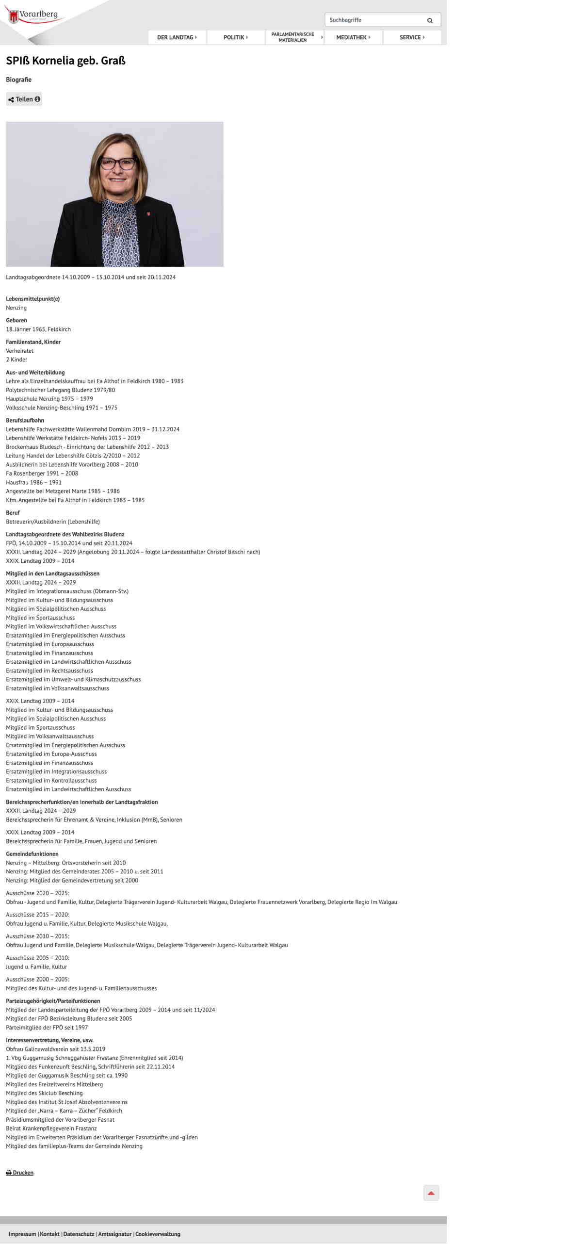 Quelle: Biographie; LTG V (Zugriff: 20.01.2026) Screenshot/Dokument: screencapture-vorarlberg-at-web-landtag-spiss-kornelia-geb-grass-2026-01-20-10_40_17.jpg
