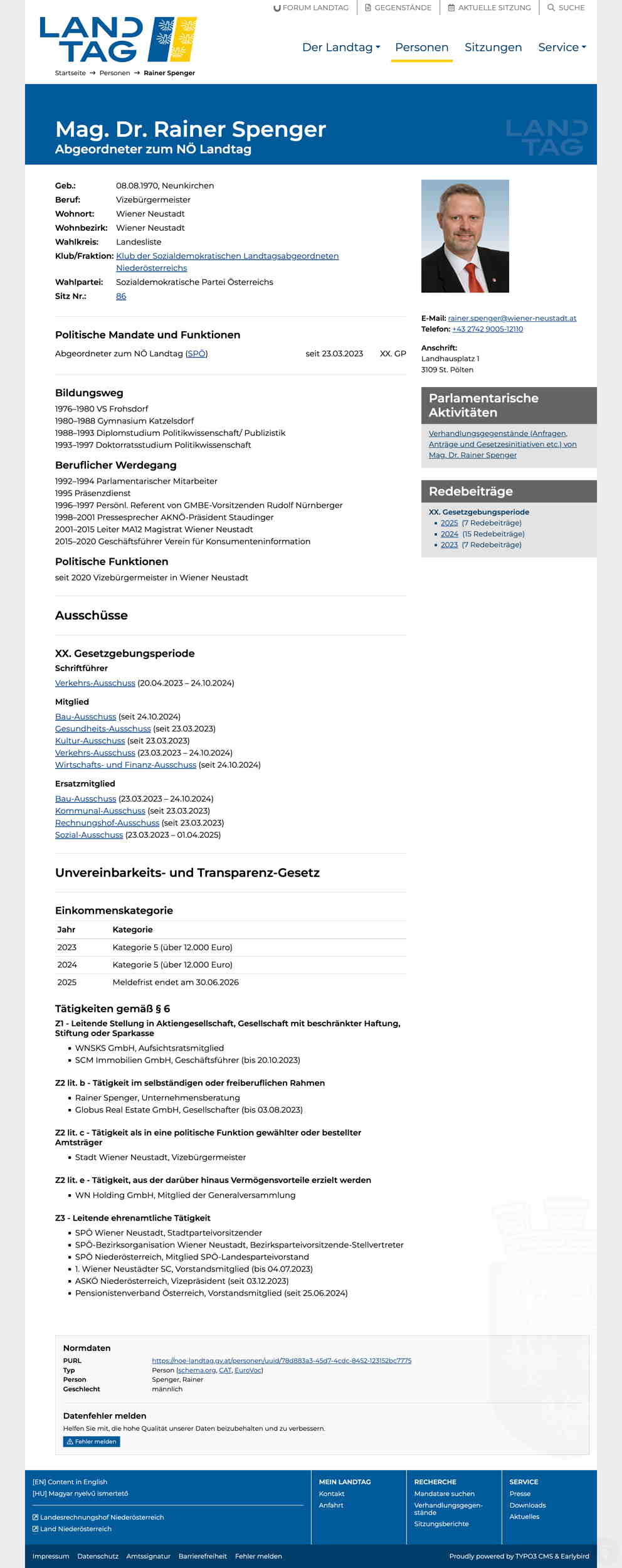 Quelle: Persönliche Seite; LTG NÖ (Zugriff: 15.09.2025) Screenshot/Dokument: screencapture-noe-landtag-gv-at-personen-rainer-spenger-2025-09-15-10_58_25.jpg