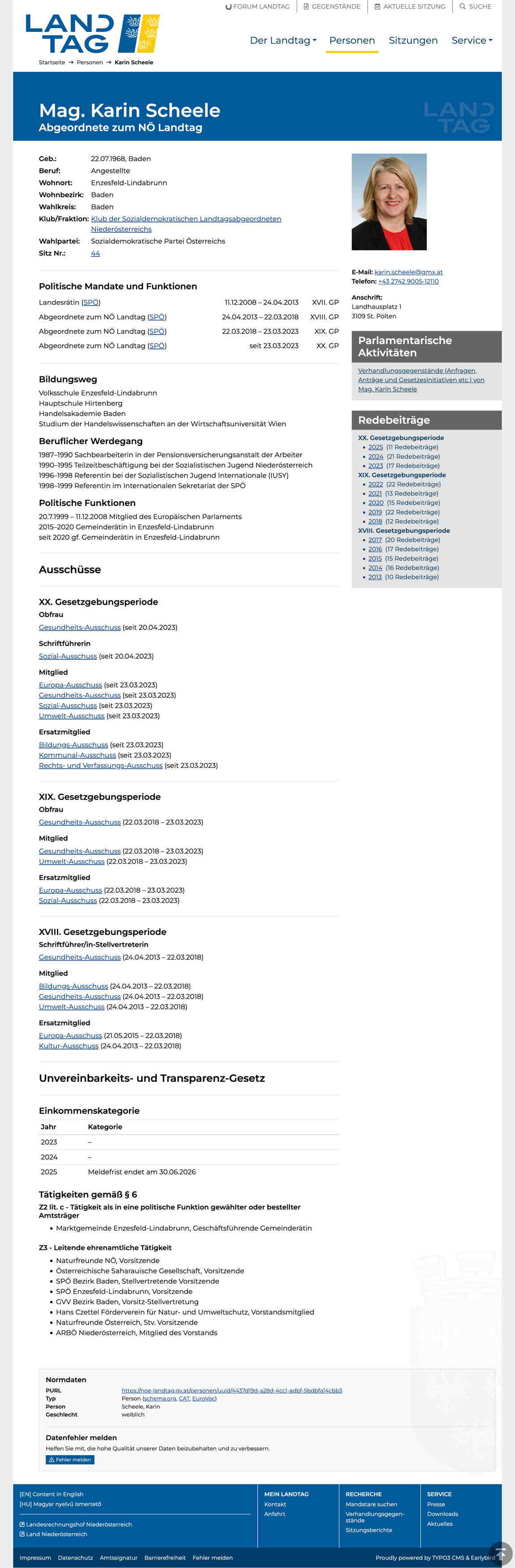 Quelle: Persönliche Seite; LTG NÖ (Zugriff: 03.09.2025) Screenshot/Dokument: screencapture-noe-landtag-gv-at-personen-karin-scheele-2025-09-03-10_44_44.jpg