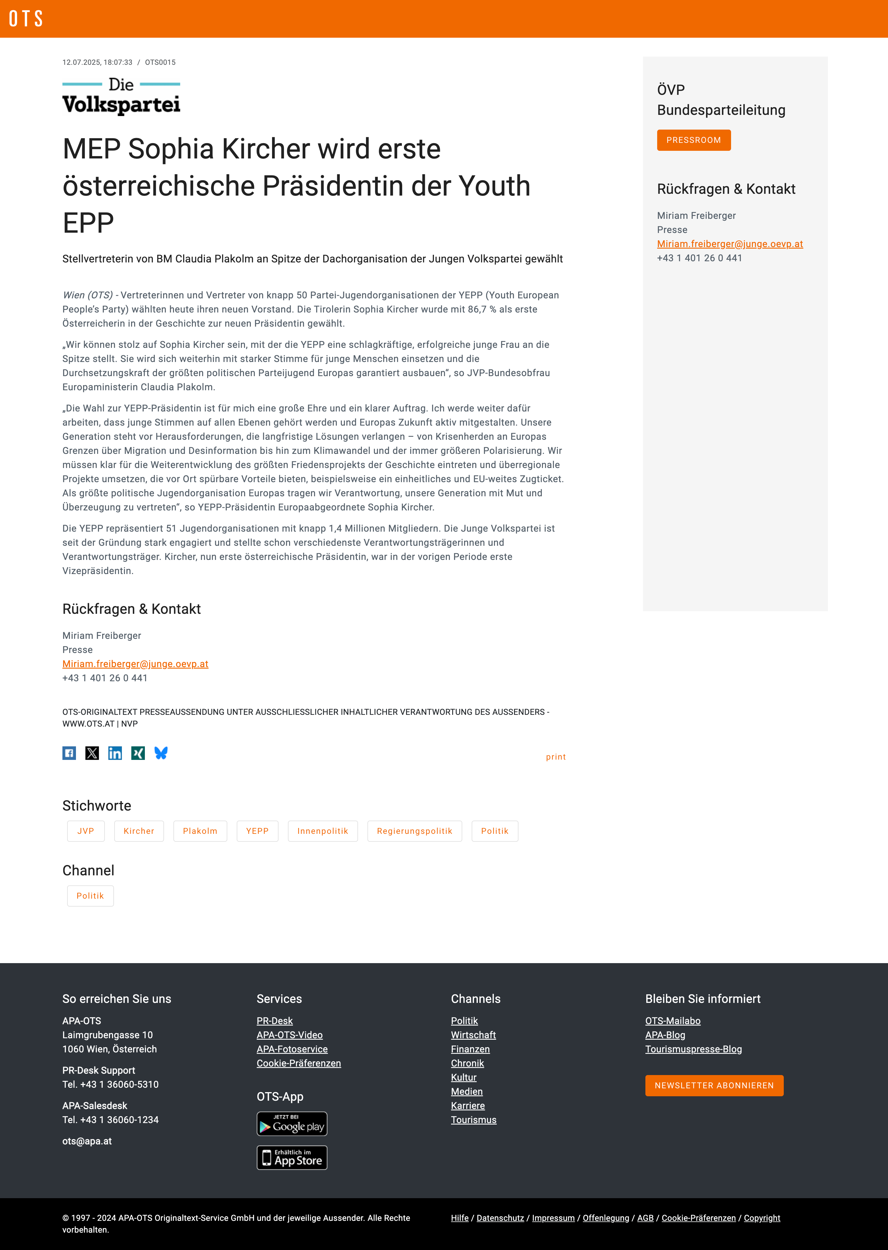 Quelle: OTS (Zugriff: 17.07.2025) Screenshot/Dokument: screencapture-ots-at-presseaussendung-OTS-20250712-OTS0015-mep-sophia-kircher-wird-erste-oesterreichische-praesidentin-der-youth-epp-2025-07-17-15_44_44.png