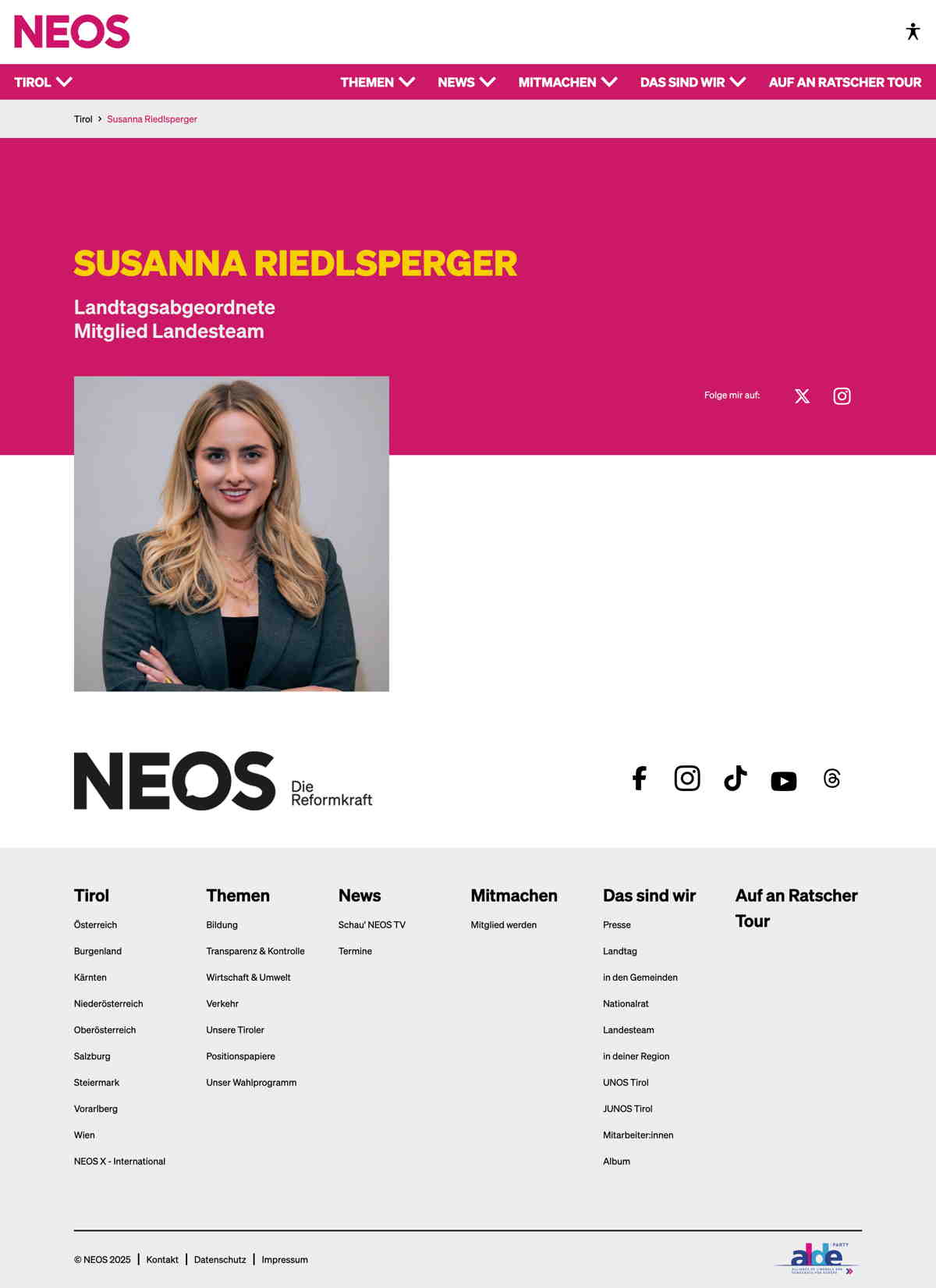 Quelle: NEOS Tirol (Zugriff: 19.02.2026) Screenshot/Dokument: screencapture-tirol-neos-eu-personen-susanna-riedlsperger-2026-02-19-10_08_25.jpg